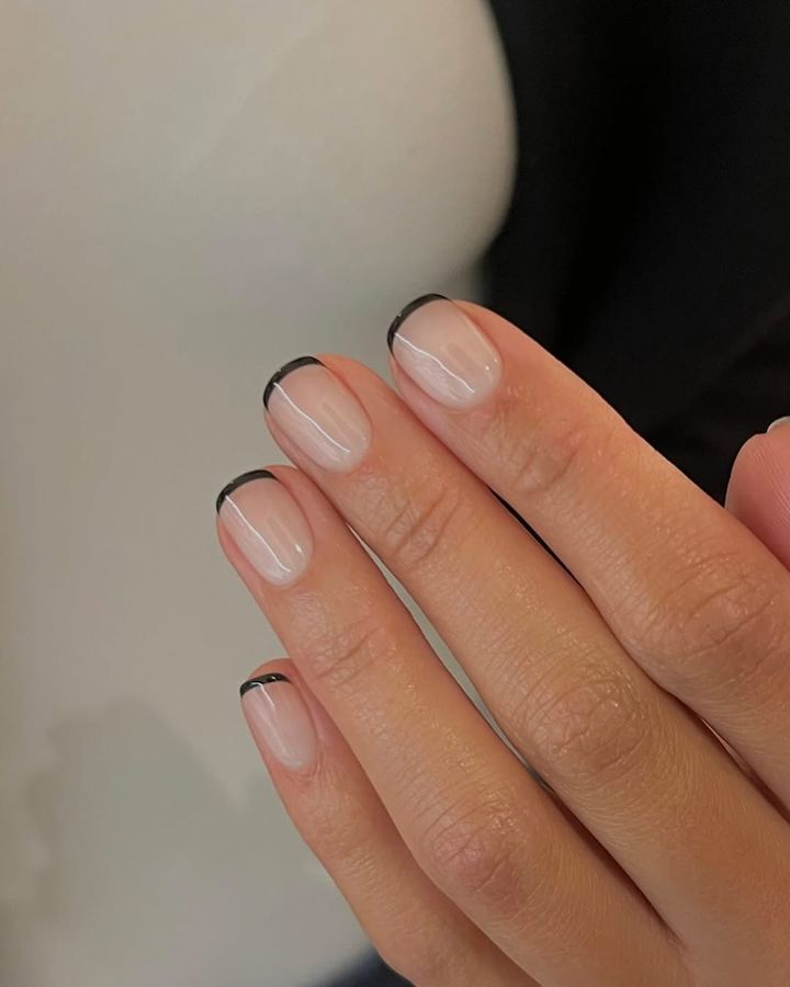 マイクロフレンチチップは、まさに高級感を感じさせてくれる。でも、黒ならもっとシックに見える。ツヤのあるトップコートを塗れば 、完璧な仕上がりになり、キューティクルをきれいにするのも◎このデザインはショートネイル派にもおすすめ!