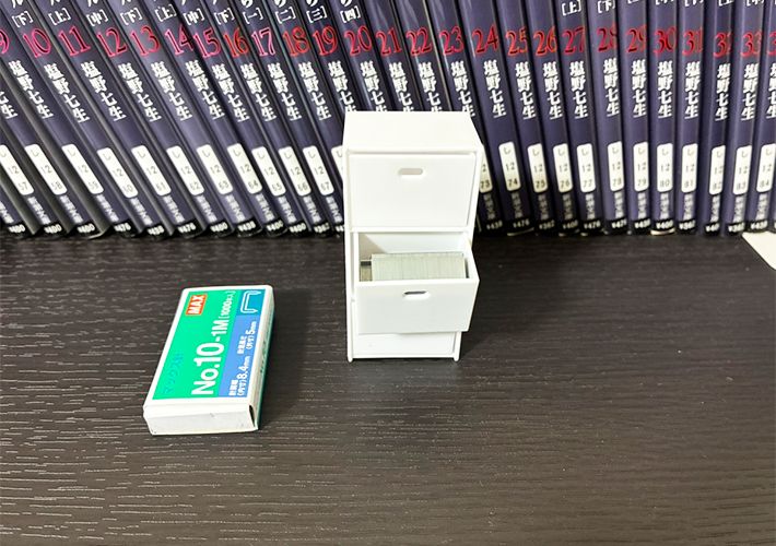 ホチキスの芯も、ミニチュアチェストの引き出しに収まりそうだったので、収納してみました。