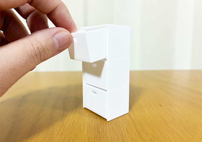 3.5cm×2.5cm×7.3cmというミニサイズながら、本物そっくりに引き出しを開閉することができます。