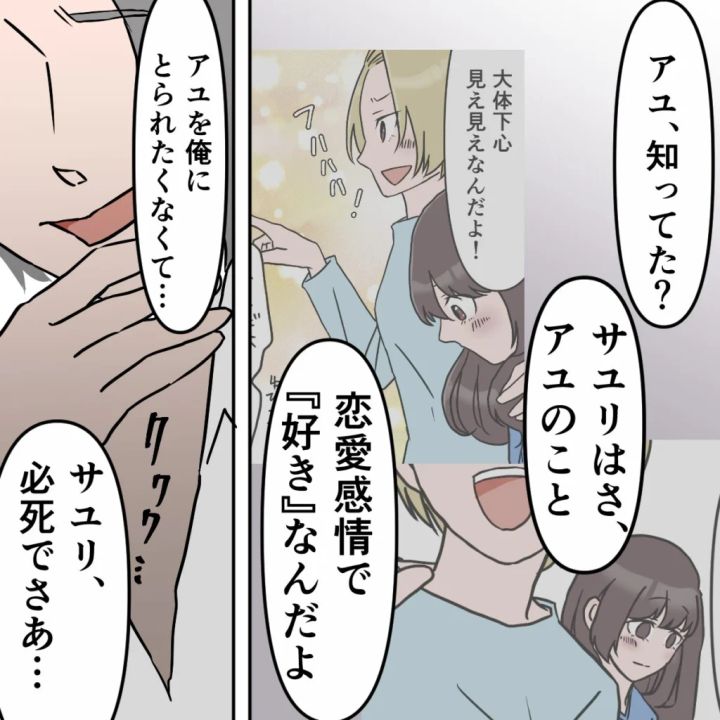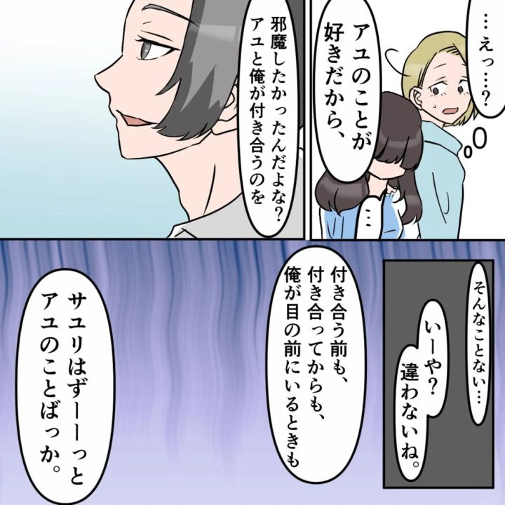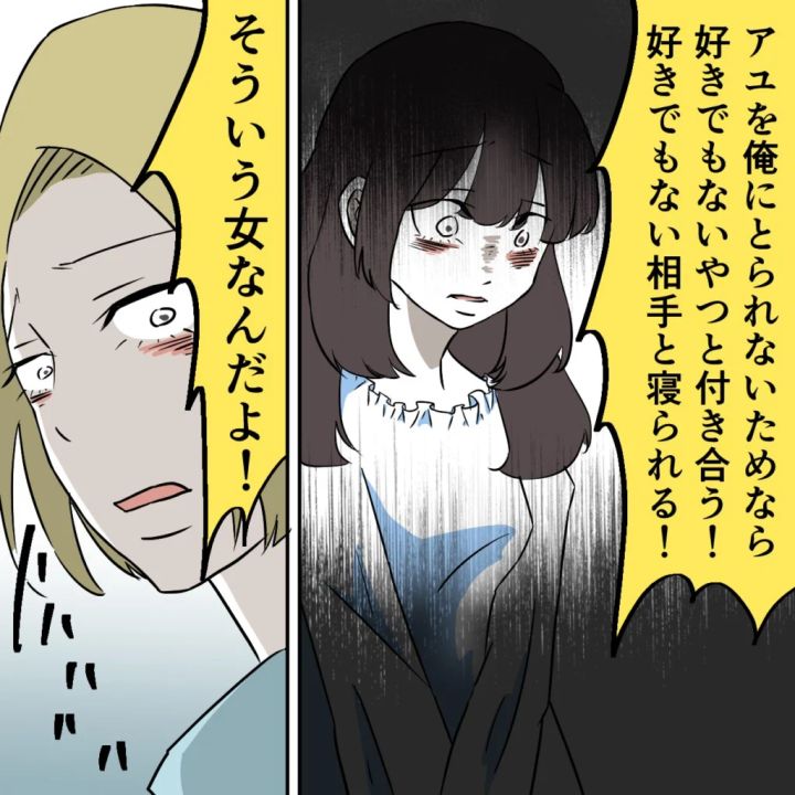 「アユを俺に取られないためなら好きでもないやつと付き合う!好きでもない相手と寝られる!そういう女なんだよ!ハハハハハ」そう言って高らかに笑い出すタクマさんとは対照的に絶望したような表情を浮かべているサユリを見て、私はどうしたら良いのかわかりませんでした。