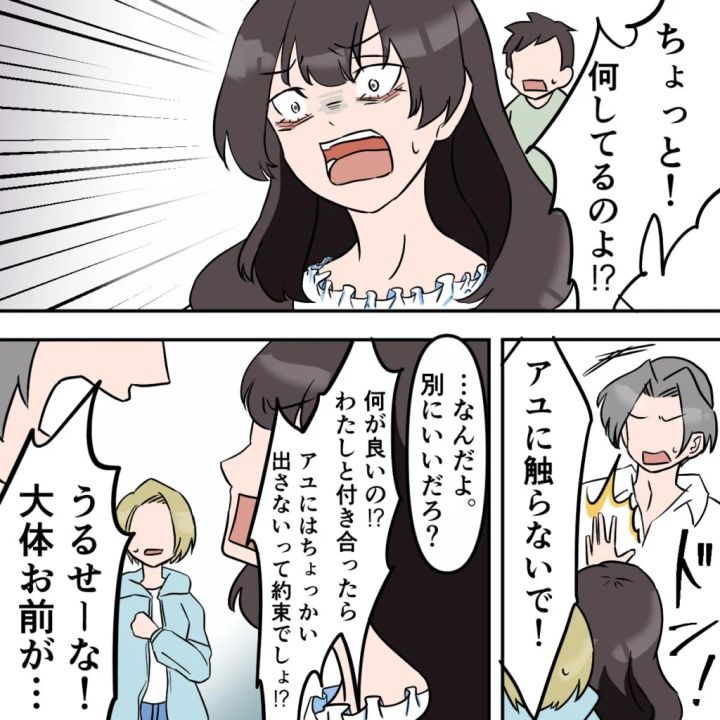 すると、タクマさんと私を探しに来たサユリ達がやって来て、「ちょっと!何してるのよ!」と血相を変えたサユリの姿が見えました。「アユに触らないで!」そう言ってタクマさんを突き飛ばすサユリに、「・・なんだよ。別にいいだろ?」タクマさんがそう言うと、「何が良いの?わたしと付き合ったらアユにはちょっかい出さないって約束でしょ!?」とサユリが言い、「うるせーな!大体お前が・・」