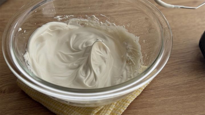2. 別のボウルに[B]を入れ、ハンドミキサーでメレンゲを立てる。もちもちと弾力があり、持ち上げた時にツノの先端がお辞儀するくらいの硬さにする。