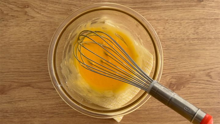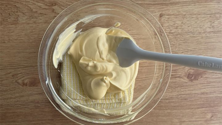 3. 2のメレンゲをひとすくい1に加え、さっくり混ぜ合わせたら2のボウルに戻し入れる。泡立て器で下からすくいあげるように混ぜ合わせる。メレンゲの筋が見えなくなったらシリコンベラに持ち替えてキレイに合わせる。