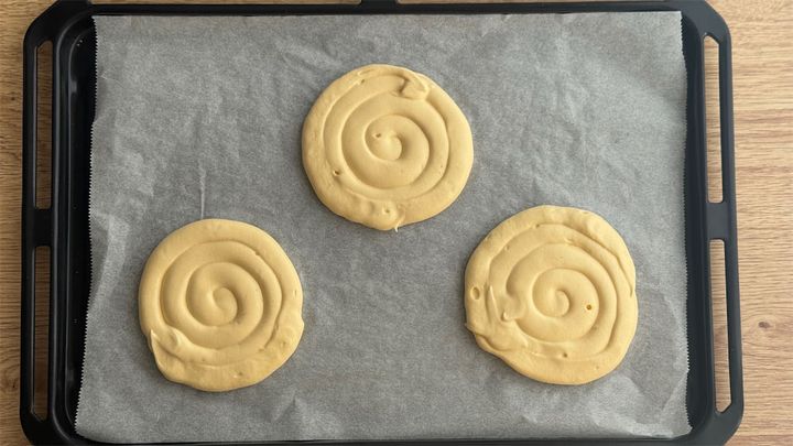 4. 絞り袋に入れ、オーブンシートを敷いた天板の上に直径10cmの円に絞りだす。180℃のオーブンで9分焼く。