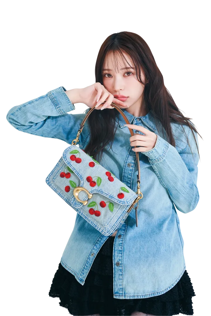 さくらんぼ柄バッグ(14×25.5×6.5cm)110,000円/コーチ(コーチ・カスタマーサービス・ジャパン)デニムシャツ 36,300円/ディーゼル(DIESEL JAPAN)レースミニスカート 14,160円/CRANK(HANASHOWROOM)