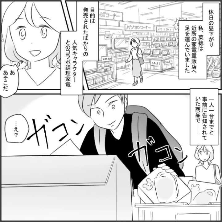 主人公はその日、大好きなキャラクターのグッズを買いに家電量販店にやって来たのですが・・・。