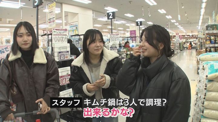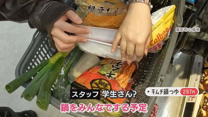 番組スタッフ:「何買ってる?」3人組:「もやしとかお肉。鍋をみんなでする予定」