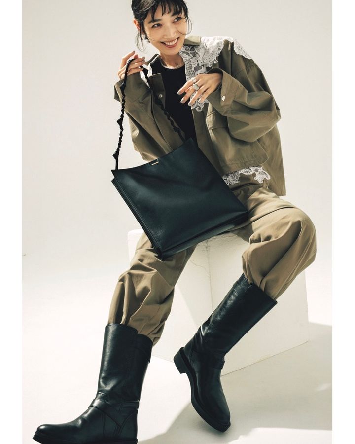4月12日(日)、レース付きのカーキジャケットは、それだけで甘辛ミックスが完成する主役アイテム。セットアップのパンツはエンジニアブーツにブーツインして、足元をあえて辛口にして。バッグも甘辛バランスを意識して、レザー素材にノットストラップのデザインを選べば、まるでレースのような繊細さとモード感を両立してくれます。iPadも入る実用的なサイズ感ながら、洗練された印象に仕上がる。甘辛ミックスを一歩先のモードへ引き上げてくれるアイテムです。