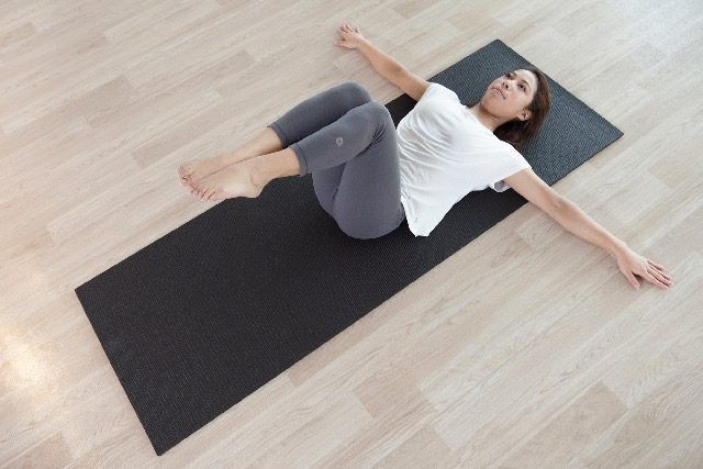 仰向けに寝て、両腕を肩の高さで横に広げます。両脚を持ち上げ、ひざを90度に曲げましょう。太ももが床と垂直になる位置を目安に、骨盤を安定させます。