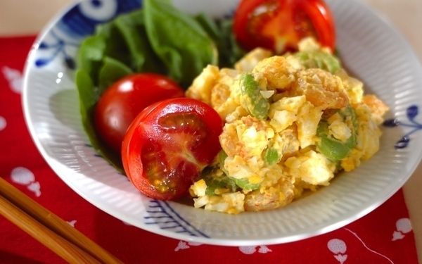 プリプリのエビと鮮やかなグリーンのそら豆は、見た目も相性もバッチリ。ゆで卵をあえて粗めにつぶすことで、そら豆の食感がより引き立ちます。子どもが好きな具材がたっぷり入っているので、お野菜が苦手な子もパクパク食べてくれるお助けメニューです。