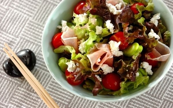 いつものサラダにそら豆をプラスするだけで、季節感たっぷりのごちそうサラダに早変わり。レタスやトマトなど、違う食感の野菜と合わせるのが、最後まで飽きずに食べるポイントです。生ハムの代わりにツナを使ったり、コーンを足したりと、冷蔵庫にあるもので自由にアレンジしましょう。
