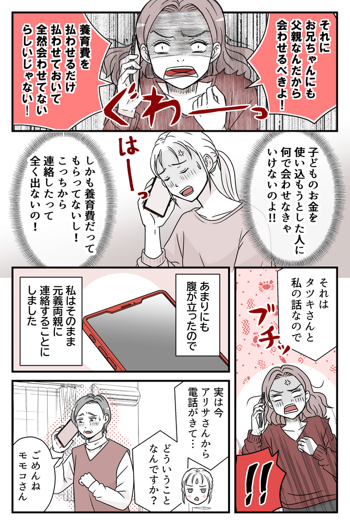 アリサさんが暴走するかもしれないから会うのを控えているのに、まるで私が金にがめつい悪者のような言い方をされ、あまりに腹が立ったので、「それはタツキさんと私の話なので」とキッパリと言い、電話を切ってしまいました。そしてそのまま、元義両親に連絡をしたのです。