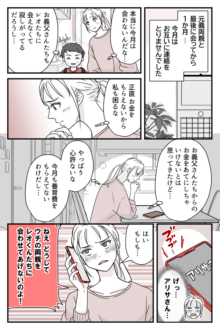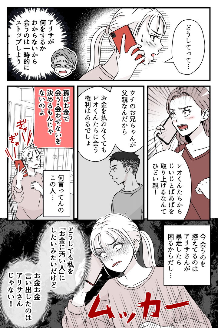 電話をしてきたアリサさんは、「どうして孫を両親に会わせてあげないのか」と私を責めてきます。元義両親からは「アリサが何をするかわからないから、会うのは一旦ストップしよう」と言われましたが、それを伝えるわけにもいかず、私は思わず口ごもります。