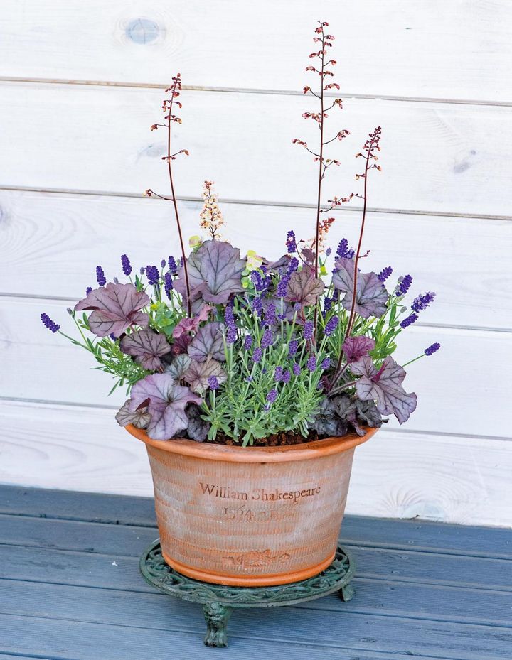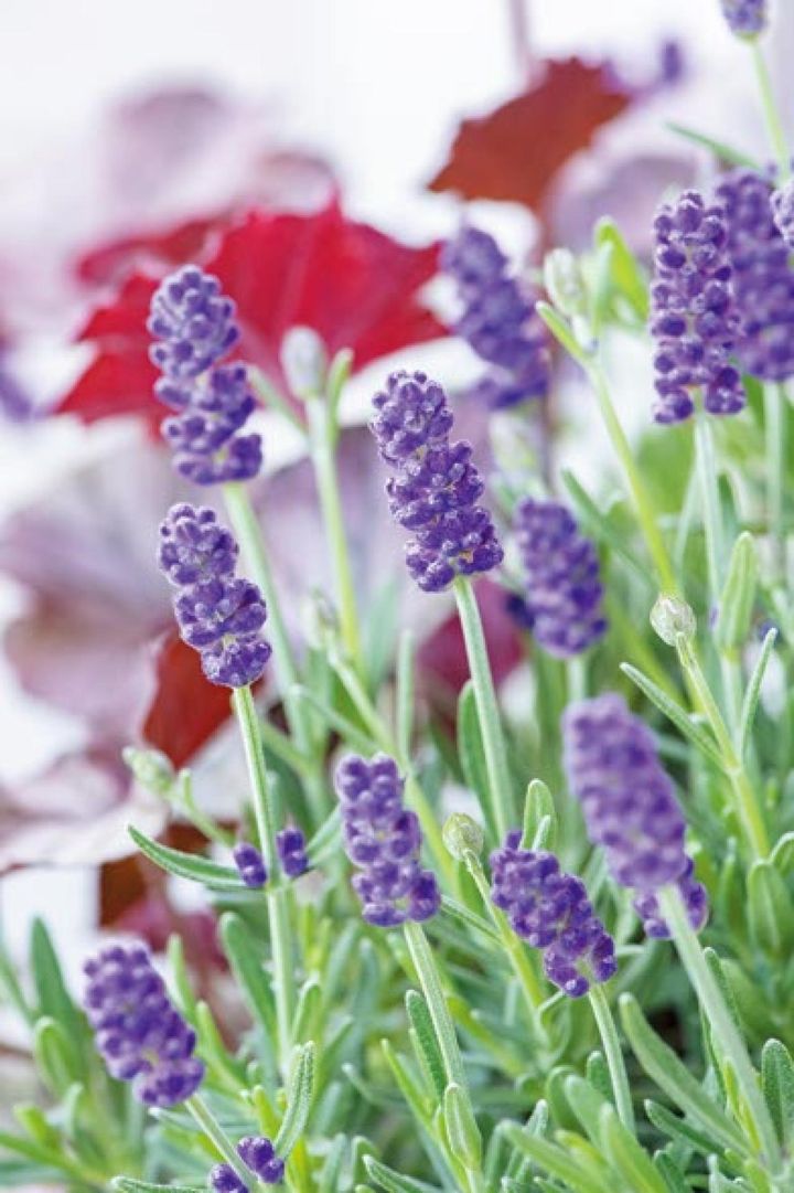 楚々とした花と、香りのよさに心惹かれるラベンダー。高温多湿の気候には弱いので、花後の夏越し対策も考え、今回はテラコッタ鉢に植えて、程よい乾燥状態を保って。ラベンダー以外はヒューケラとオレガノでシンプルに。夏越しがうまくできれば、翌年以降はさらに株が大きく育ちます。