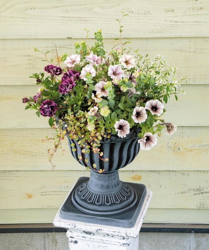 春の王道プランツのひとつが、ペチュニア。花色が豊富ですが、最近はくすみピンクやベージュ、ボルドーなどニュアンスカラーと呼ばれる落ち着いた色味の花が数多く出ています。それらを使って、ひと味違ったおしゃれな寄せ植えに。合わせる鉢は脚つきのカップ形の鉢をチョイス。緑の間からペチュニアや葉ものを下垂させれば、エレガントな仕上がりになります。