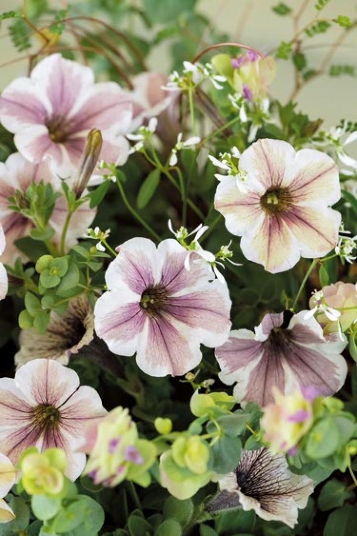 花色、花の大きさ、一重咲き、八重咲き、株姿などバラエティーが豊富。同系色でまとめる、葉ものと合わせるなど組み合わせは無限大。ペチュニアは肥料が大好きなので、定期的な施肥を忘れずに。