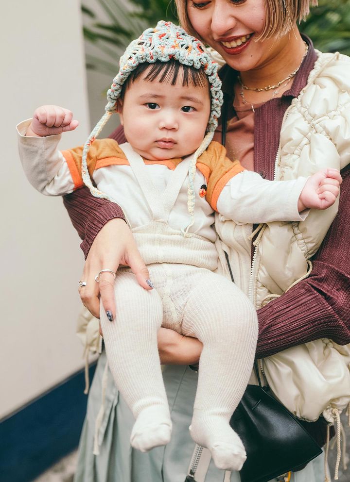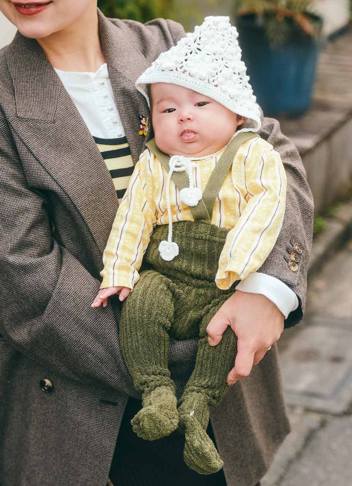 NAME:Aちゃん・0歳まるでテディベアのような質感がたまらなく可愛い『シリーサイラス』の肩紐つきタイツを主役にした、ほっこりキュートな着こなし。花柄トップスとヴィンテージライクなリブ素材のボトムが相まって、どこかレトロなムードに。ボヘミアン調の白のカギ編みハットもポイントになって、やわらかな雰囲気を引き立てるスタイリング。item▼