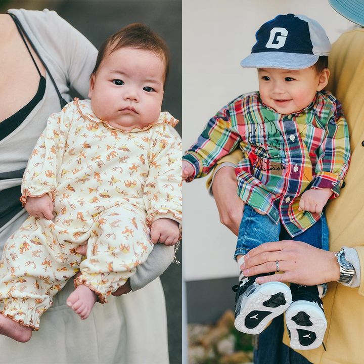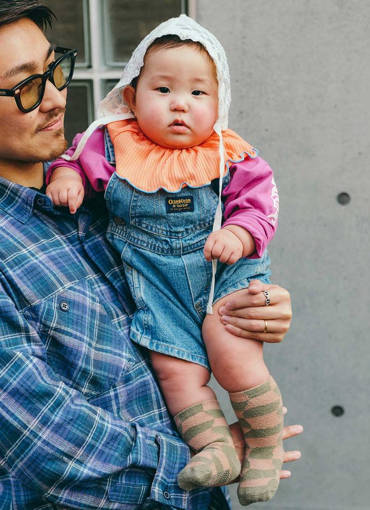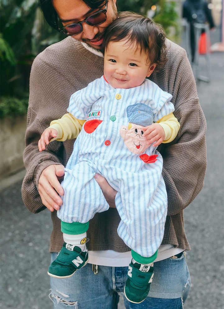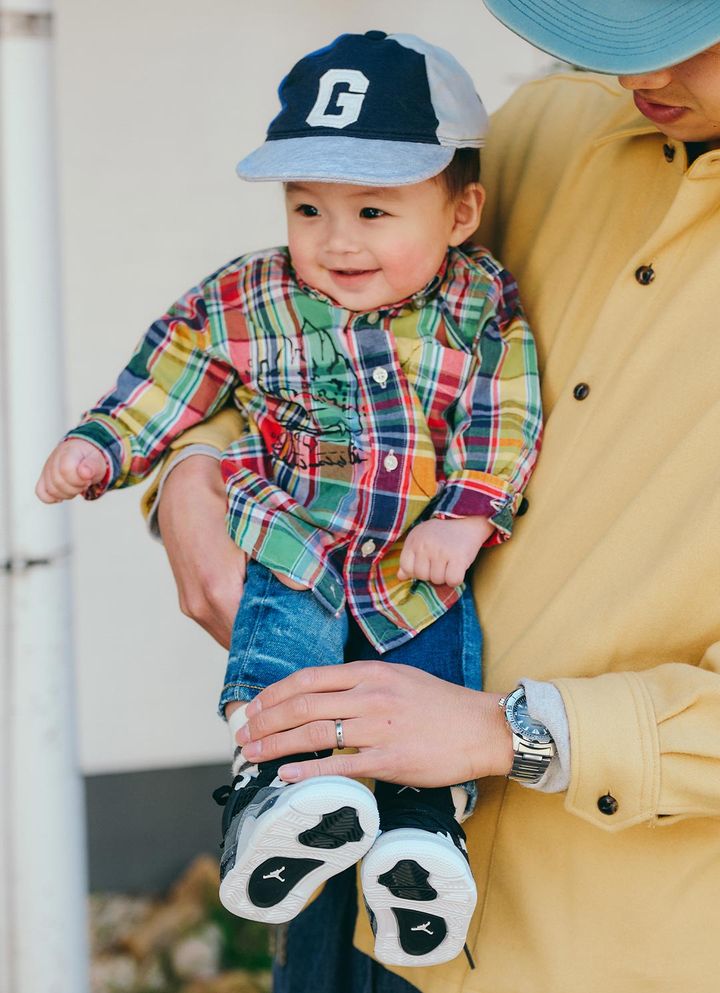 NAME:てんくん・0歳パパに抱っこされて上機嫌なてんくん。カラフルなチェック柄シャツに色落ちデニム、頭には、ブランドロゴがアクセントになったキャップを合わせて、アメカジスタイルを堪能中。足元は『ジョーダン』のスニーカーで、ちょっぴりストリートにハズしたこなれたミックスコーデ。item▼