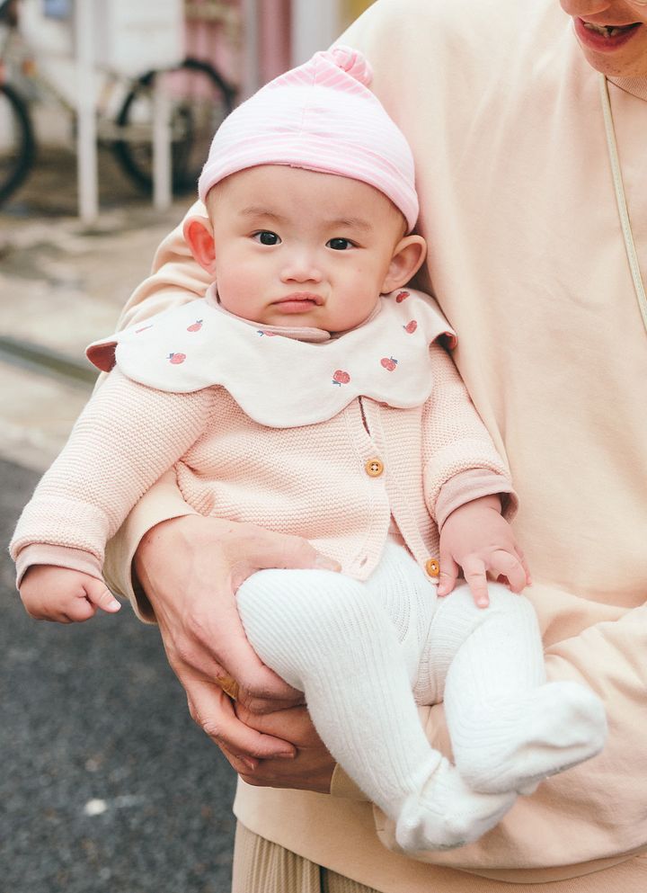 NAME:eiraくん・0歳ペールピンクのカーディガンに温かみのある白のタイツを合わせたやわらかな雰囲気のeiraくん。ピンクの濃淡を重ねて、ストライプ柄のニット帽やリンゴ柄のスタイをさりげないアクセントにしたグラデーションコーデに。やわらかな配色に癒される、愛らしいスタイリング。item▼