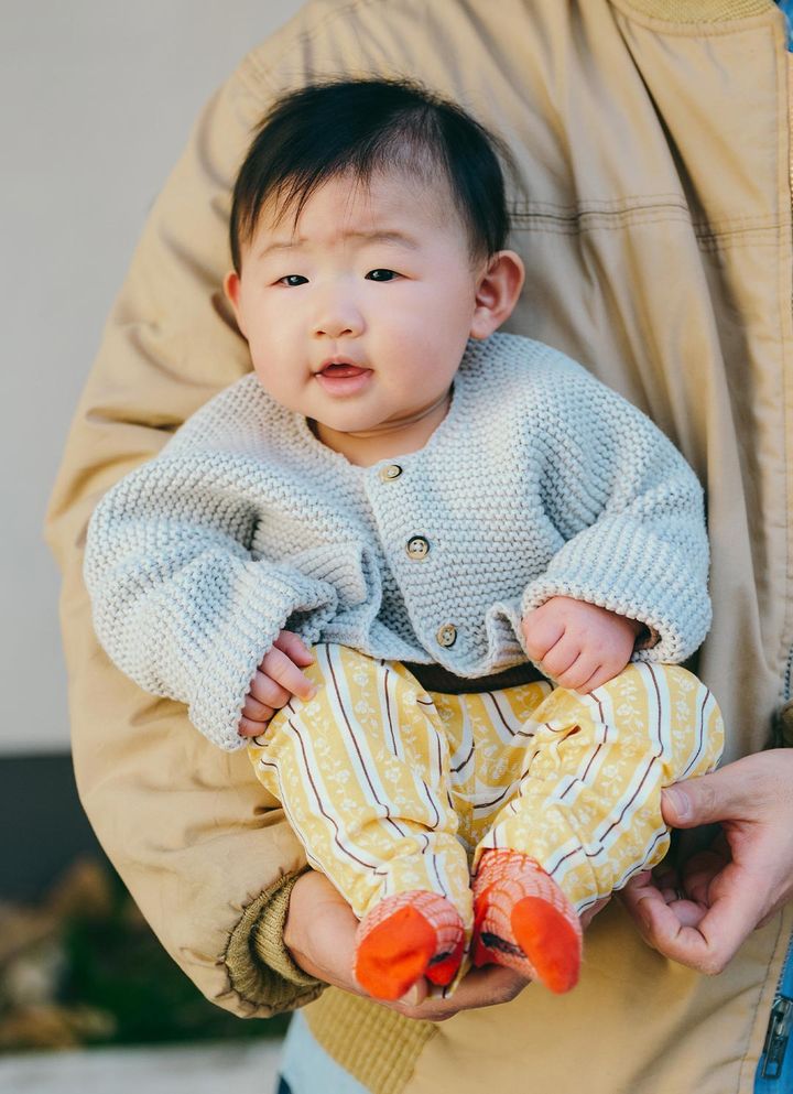 NAME:KIちゃん・0歳ぷっくりとした質感が愛らしい『プチバトー』のガーター編みニットカーディガンに、『ハウスオンザヒル』のレトロな花柄ボトムを合わせたKIちゃん。ライトグレー×イエローの配色に、オレンジソックスで元気いっぱいなアクセントをプラス。ほどよく遊び心を取り入れた品のよさが魅力。item▼