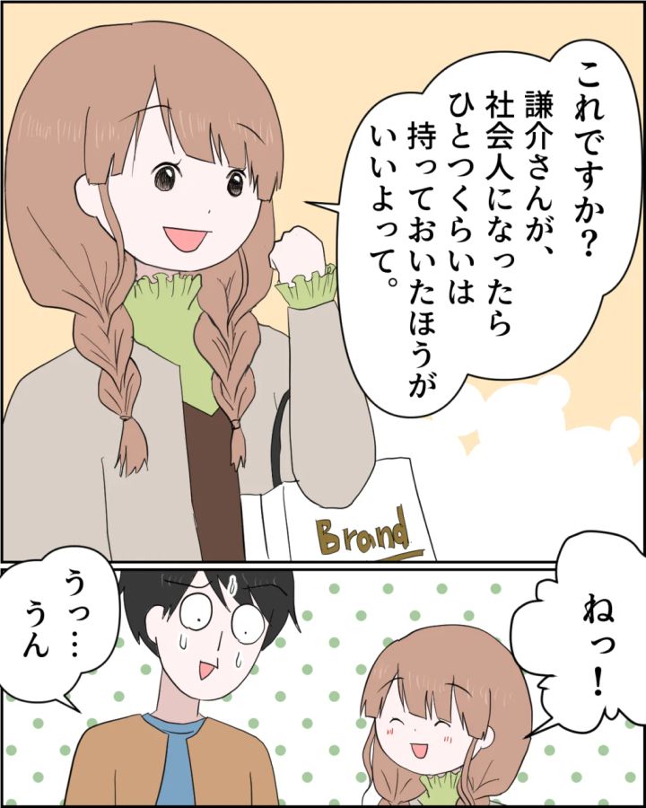 しかし、あかりちゃんは「これですか?謙介さんが、社会人になったらひとつくらいは持っておいたほうがいいよって」と顔色一つ変えずさらりと答えると「ねっ!」と隣の謙介に笑顔を向けました。謙介は気まずそうに「うっ・・うん」と答えるのが精一杯といった様子。