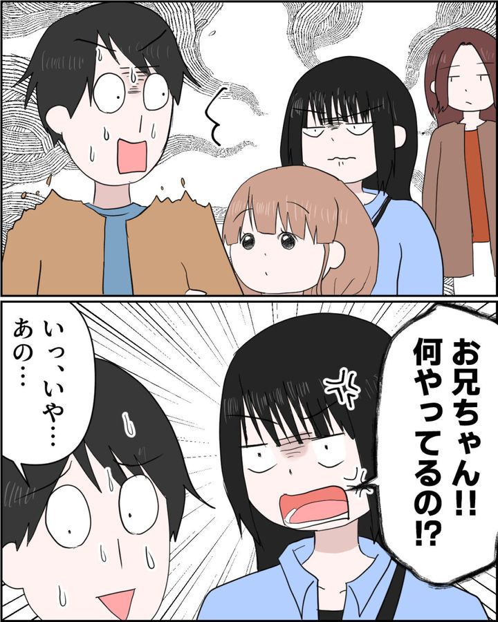 まさかの遭遇に慌てふためく謙介は「お兄ちゃん!!何やってるの!?」と舞花ちゃんに詰め寄られると「いっ、いや・・あの・・」としどろもどろに。