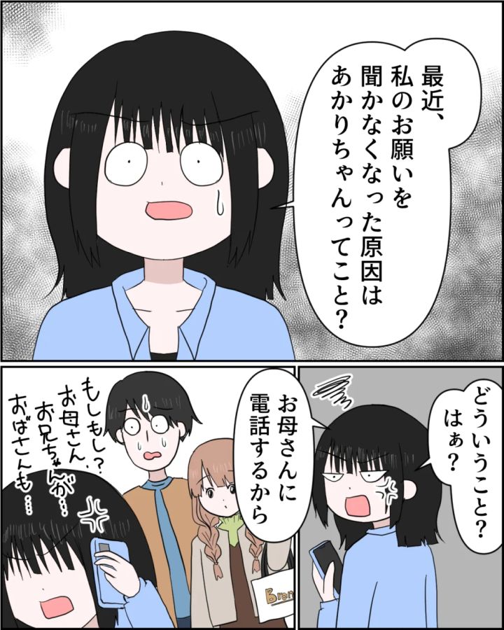 「最近、私のお願いを聞かなくなった原因はあかりちゃんってこと?」謙介とあかりちゃんの様子を見てすべてを察した舞花ちゃんは「どういうこと?はぁ?お義母さんに電話するから」と怒りと嫌悪感の入り混じった様子でそう言うと、すぐに母親に電話をかけ謙介とあかりちゃんのことを報告しました。