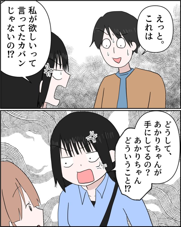 「えっと。これは・・」と口籠る謙介に、「私が欲しいって言ってたカバンじゃないの!?どうしてあかりちゃんが手にしてるの?」と詰め寄り、「あかりちゃん、どういうこと!?」とあかりちゃんにも怒りを向ける舞花ちゃん。