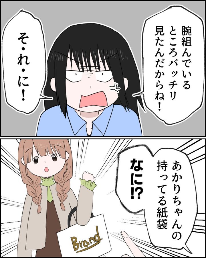 舞花ちゃんの追及はまだまだ続きます。「腕組んでいるところバッチリ見たんだからね!そ・れ・に!あかりちゃんの持ってる紙袋、なに!?」と声を荒げながらあかりちゃんの腕のショッパーを指さす舞花ちゃん。