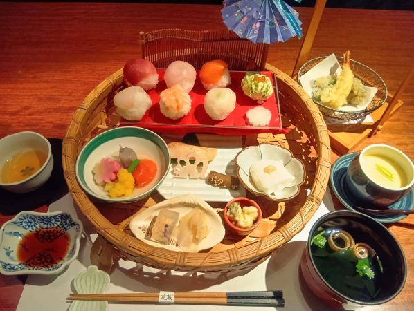 「おもてなし花かご膳」です。 花かごに添えられた小さな傘の下で手毬寿司たちが勢揃い。何だか女の子たちがお花見してるみたい♪ めちゃかわいい〜。 そして、お料理の種類が豊富。こちらのランチはデザート&コーヒーも含めて11種類! もう興奮が止まらない(笑)