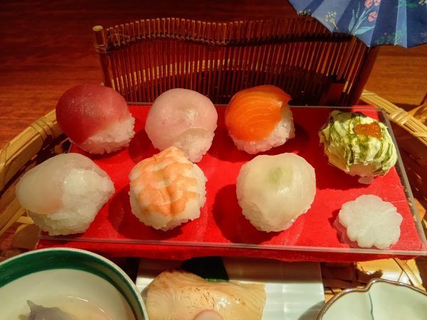 手毬寿司はマグロやサーモン、蒸し海老、とろろ昆布巻きなど。 サイズ感が思ったより大きく、食べ応えも充分。
