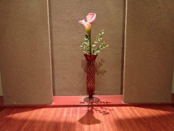 案内された個室には、素敵な一輪挿しが。 足元には小型電気ストーブもあり、おもてなしに感動・・。