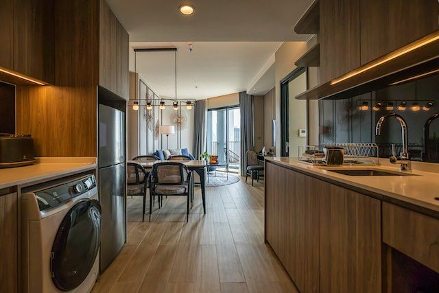 キッチン、さらに乾燥機能付きの洗濯機まで備えられており、設備のそろえ方は一般的なホテルとは明確に異なります。