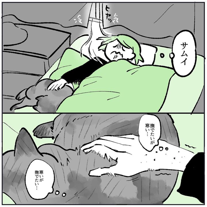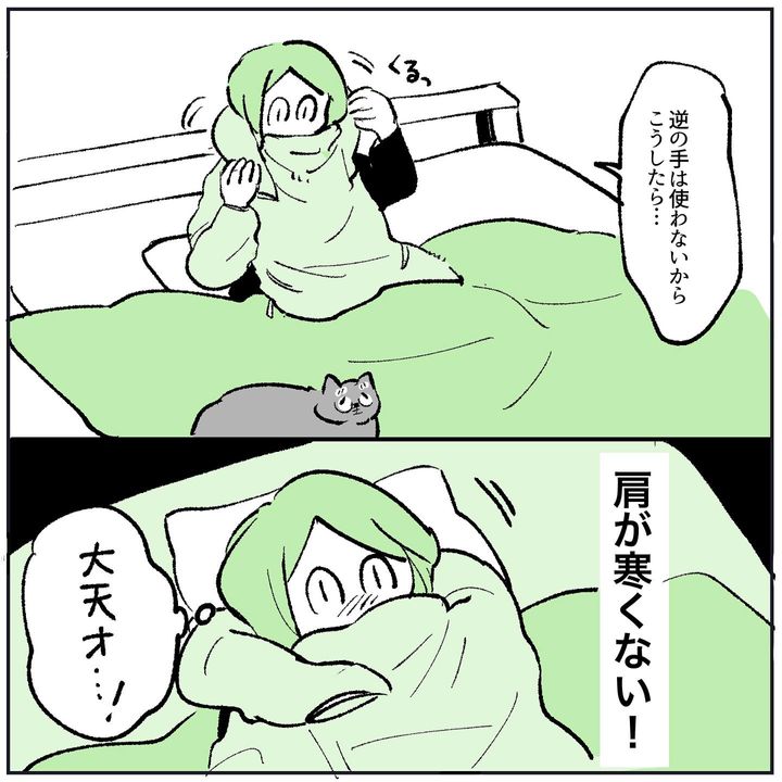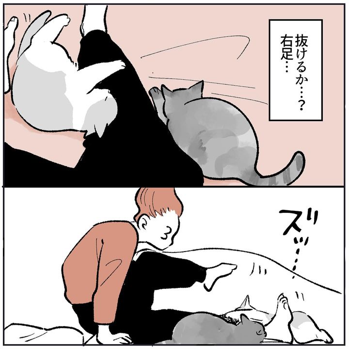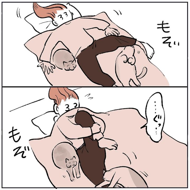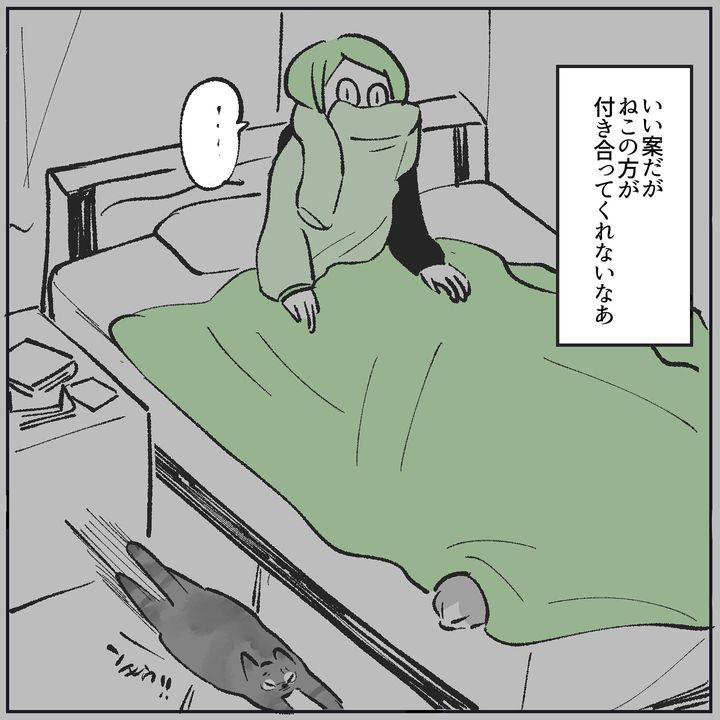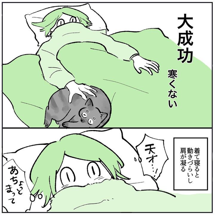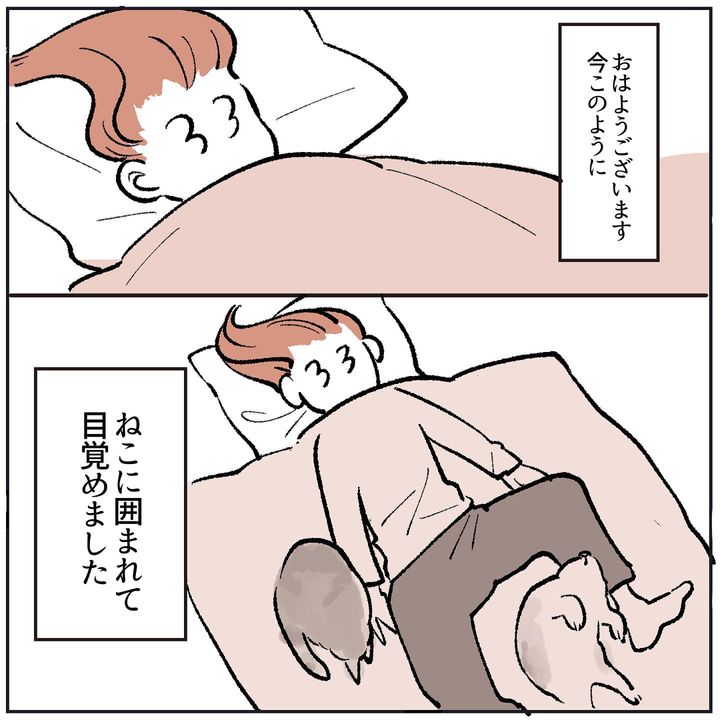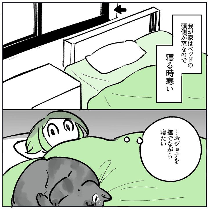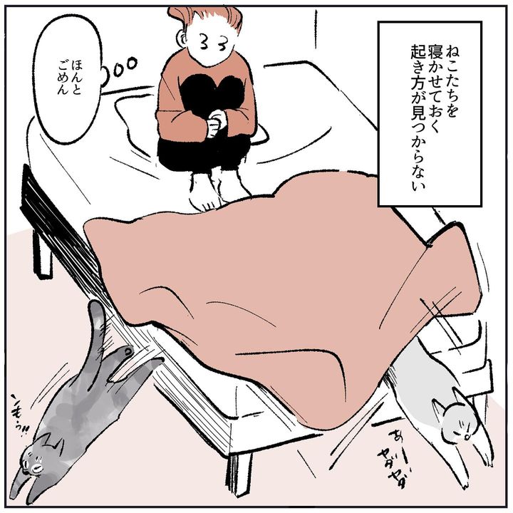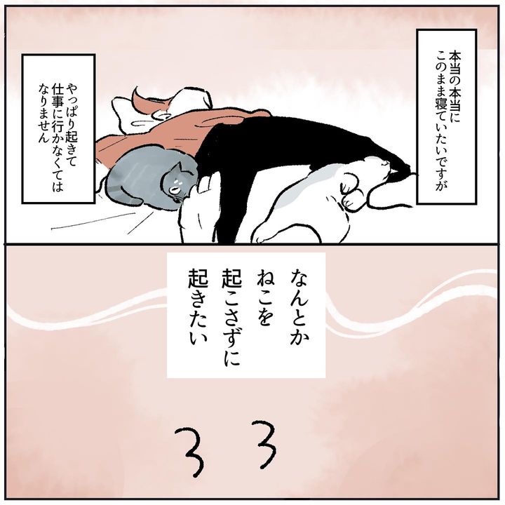 朝寝るとき、夜起きるとき。すぐ近くに愛しい猫たちがいてくれれば、それだけで人生の幸せは倍増するもの。長谷川ろくさんも、そんな至福の時間を夢見るひとりです。夜は寒さに耐えながらも「2匹を撫でてから眠りたい」と手を伸ばし、朝は「かわいい寝顔を汚さぬよう、ひっそりと準備しよう」と心に決める。しかし…残念ながら、現実はそう甘くはありませんでした。