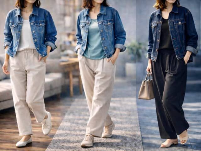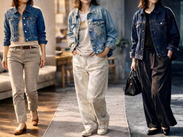 ジージャンはラフなアイテムだからこそ、合わせ方で印象が大きく変わるもの。厚みのあるボトムや暗い色味ばかりを重ねると、全体が重く沈んでしまい、抜け感がなくなります。
