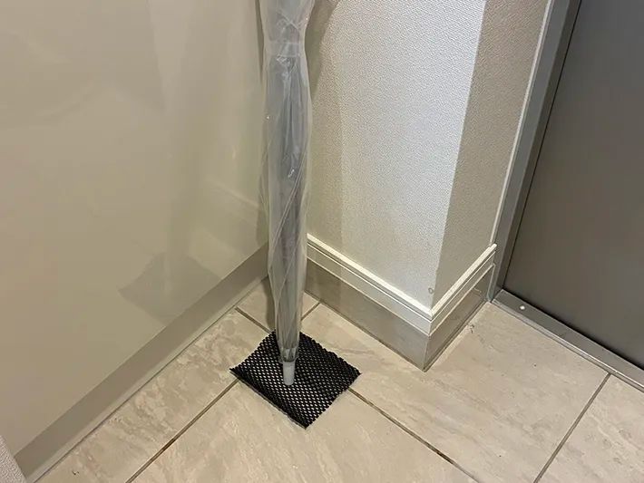 傘の先端に合わせて小さくカットしたシートを床に敷いてみると、すべりにくくなり、比較的安定して立てられるように!
