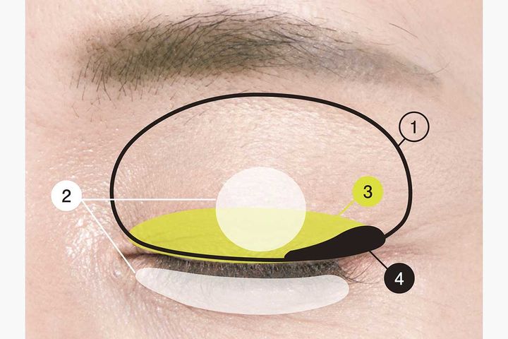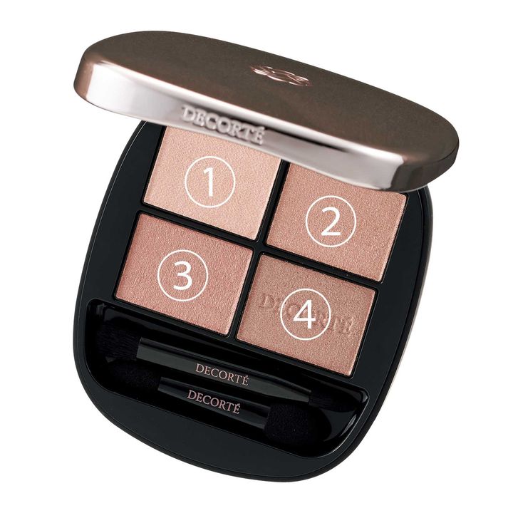 ①くぼみを埋めるよう広めにのせてフラットな土台を。②を黒目の上に丸く塗布。目の下にものせトーンアップを。③を二重の幅でのせ明るさとツヤをプラス。④を目尻の際につけて引き締める。