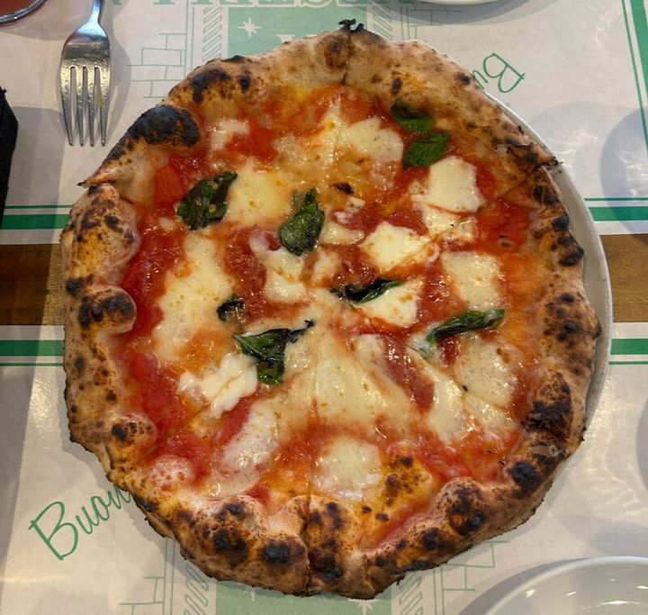 新鮮で味が濃いおいしい信州野菜のサラダと、パスタはイカスミのリングイネ、メカジキ、菜花、カラスミのリングイネ、信州牛のボロネーゼのスパゲティと3種類から、ピザはトマトベースが4種類、モッツァレラベースが4種類から選べます。今回はピザ狙い、そして私はピザといえばマルゲリータ一択なので一秒の迷いもなし。パートナーは燻製モッツァレラ、自家製ソーセージ、カブの菜花がのったフリアリエッリを選んでいました。ピザは薪窯で焼きあげられたもっちもち生地でおいしい!! ドリンクはコーヒー、紅茶類以外にブラッドオレンジジュースや信州産りんごジュースなども選べるのが嬉しいですね。