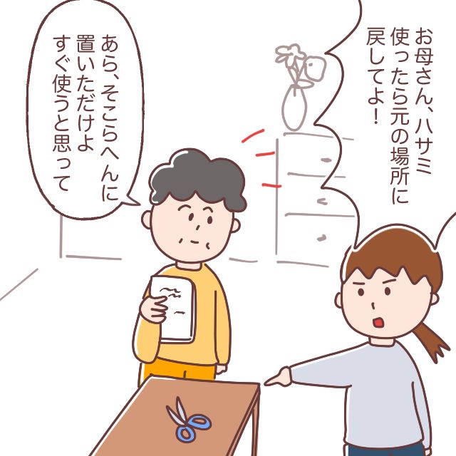 またある日。机の上に出しっぱなしのハサミを見つけた妻が「お母さん、ハサミ使ったら元の場所に戻してよ!」とすぐに犯人を突き止めて注意すると、「あら、そこらへんに置いただけよ。すぐ使うと思って」義母はシレっと答えます。