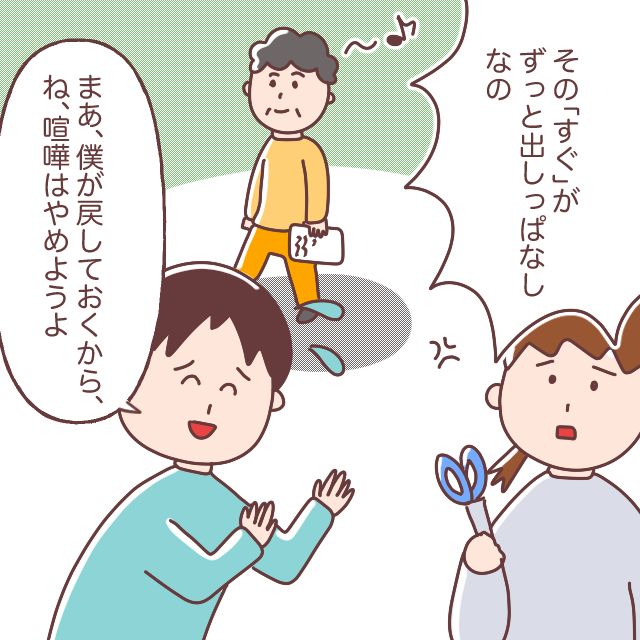 「その『すぐ』がずっと出しっぱなしなの」と怒りをにじませる妻を見て、「まあ、僕が戻しておくから、ね、喧嘩はやめようよ」喧嘩にならないように、僕がなんとかなだめようとすると、