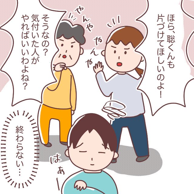 「ほら、聡くんも片づけてほしいのよ!」妻の言葉でとうとうゴングが!「そうなの?気づいた人がやればいいわよね?」と義母も言い返し、やんややんやの騒ぎに。2人が喧嘩しないよう、妻にも義母にも気を遣っているのに・・結局喧嘩しないと終わらないのでした。