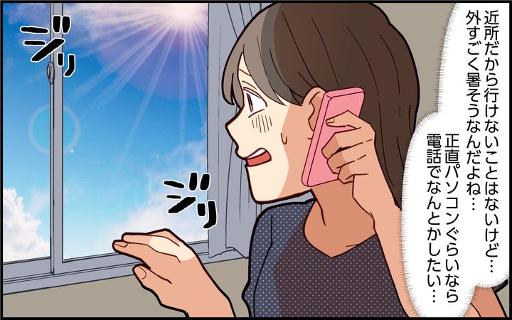 「今すぐ来て~」とお義母さんから言われましたが、いくら近所とはいえ、この暑いなか重いお腹で歩いて出向くのは大変です。パソコンが動かないくらいなら、正直、電話でなんとかしたかったのに…。