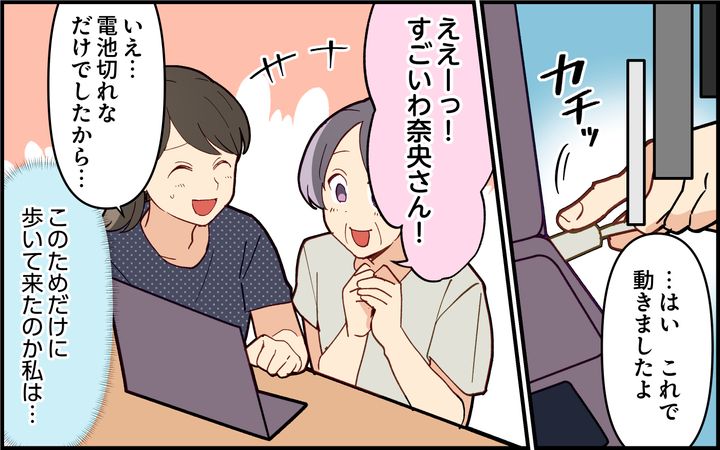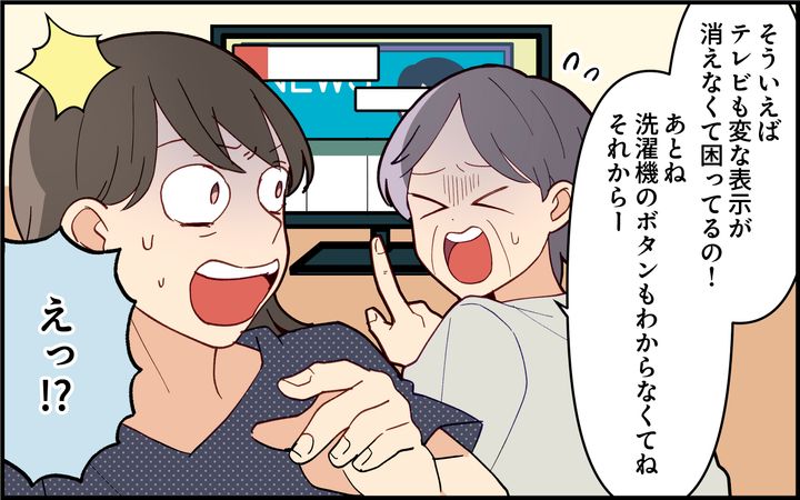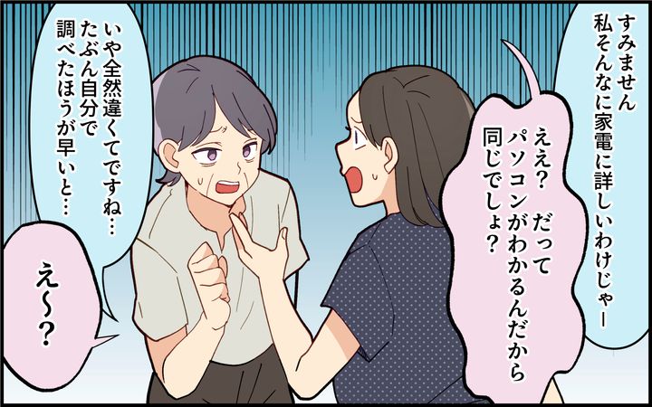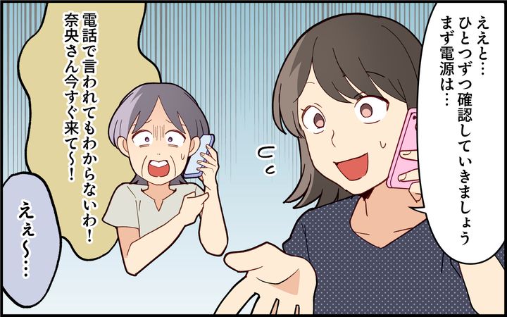 「パソコンを立ち上げることはできますか?」私のこの質問に、電話口でお義母さんが立ち上がっていました…。しょうがないので義実家へ行ってみれば、ただの電池切れというオチ。その後もお義母さんはテレビだ、洗濯機だと次々に家電のトラブルを相談してきたのです。私、家電にはそんなに詳しくないし、自分で調べた方が早いんじゃないかな~。