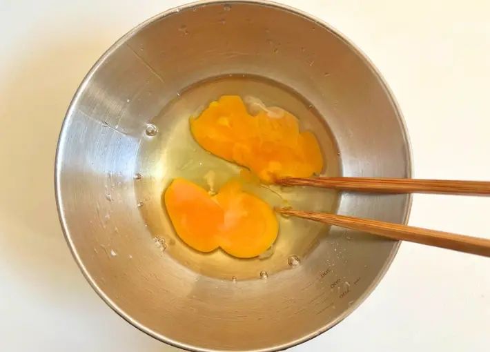 次に、ボウルに卵2個ぶんを割り入れ、溶きほぐします。
