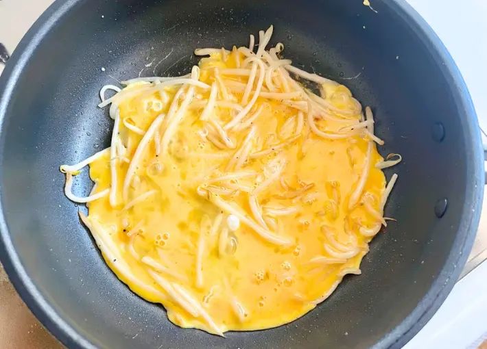 そこへ溶いた卵を加え、モヤシと混ぜます。