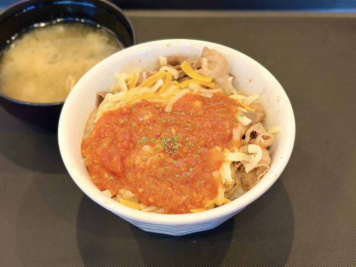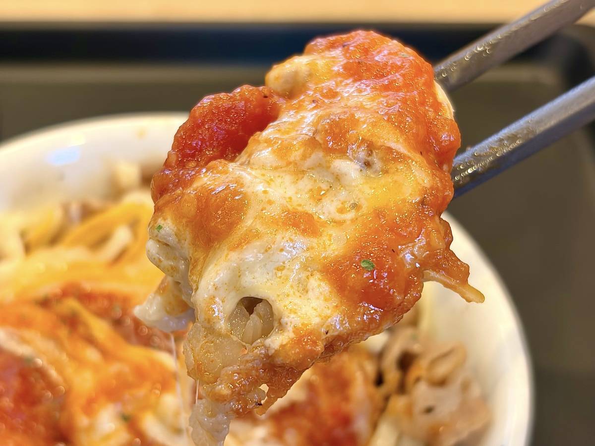 お店自慢の牛めしにトッピングされた、濃厚なチーズ&たっぷりのうまトマソース。