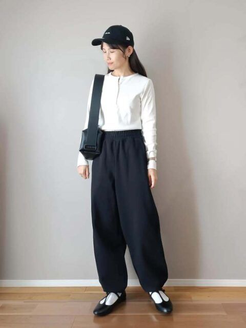 ダボッとしたシルエットで楽ちんなのにオシャレに決まる「カーブパンツ」。カーヴィーなシルエットにこなれ感があり、今どきのルックスに。対して裾まわりはほっそりしているので、スタイルアップも叶いますよ。