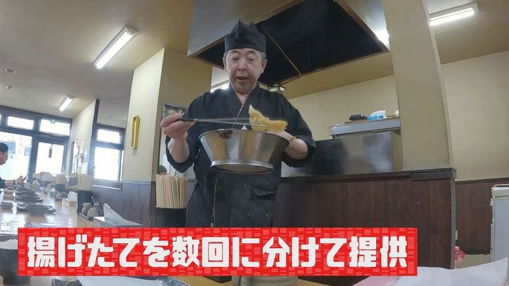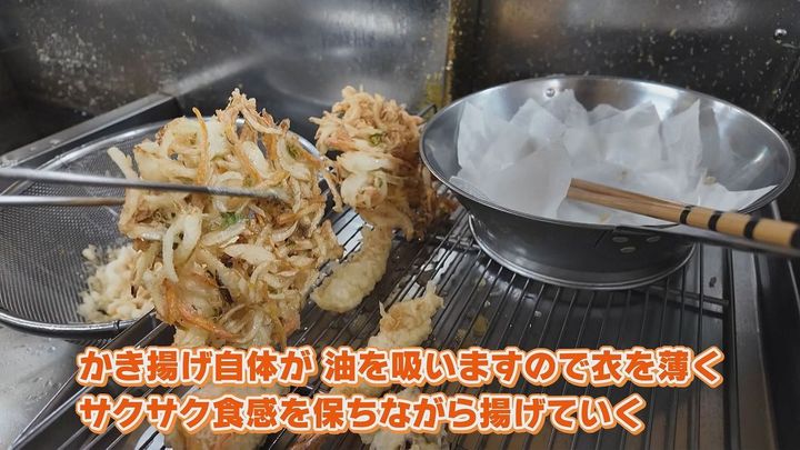 店長 西保さん:「かきあげ自体が油を吸いますので、衣を薄くサクサク食感を保ちながら揚げていくのがポイント」