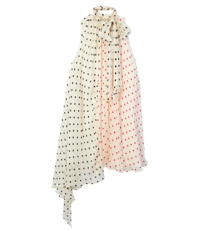シフォン素材のドラマティックなワンピースを、赤と黒のポルカドットで軽快に。ワンピース¥132,000