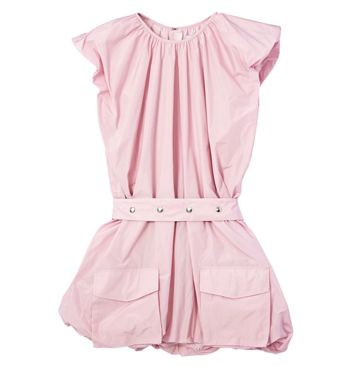 ハリのある素材による構築的なフォルムが、少女のようなベビーピンクを強気なレディへ引き上げる。ワンピース¥113,300※参考価格
